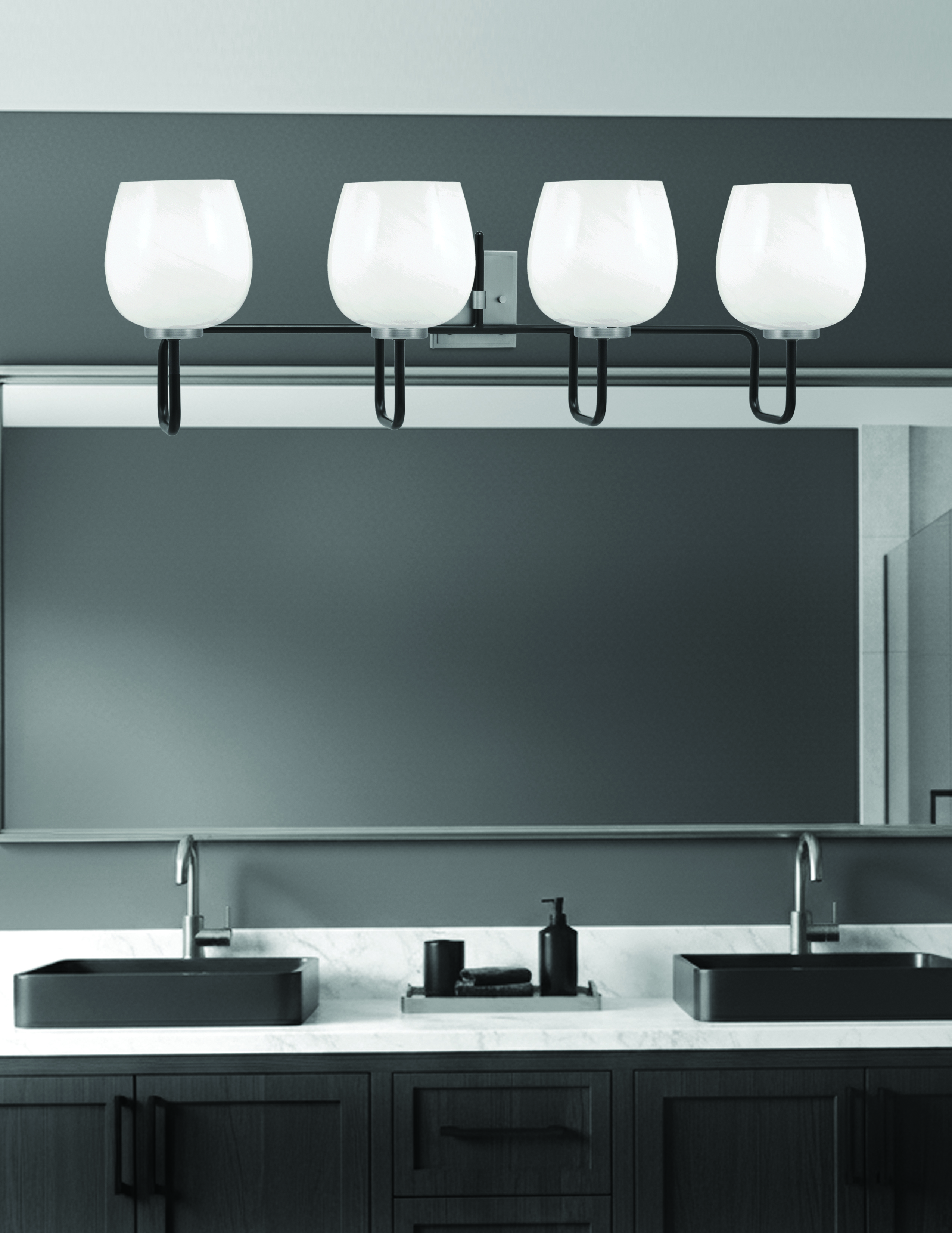 Create a refined and elegant atmosphere in your bathroom with the Sandia 4 Light Bath Bar. Finished in Matte Black & Graphite, this fixture offers a sleek industrial edge. The four 6-inch white marble glass shades feature a delicate marble-like finish that introduces a touch of luxury to your space.