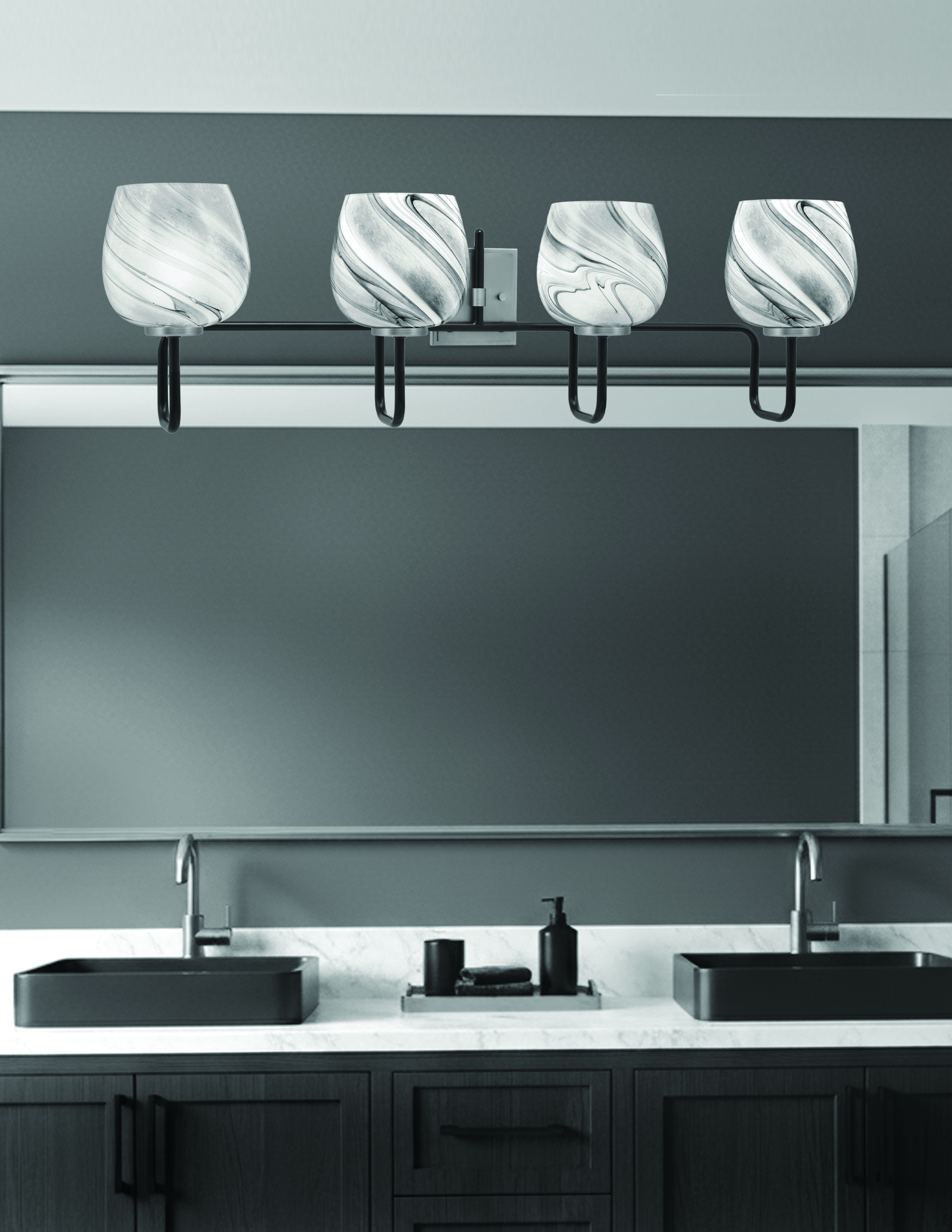 Add a touch of sophistication and drama to your bathroom with the Sandia 4 Light Bath Bar. The Matte Black & Graphite finish offers a bold, industrial flair. The four 6-inch onyx swirl glass shades feature a unique swirling pattern that adds depth and dimension to the fixture. A perfect combination of modern style, artistic glass design, and practical illumination.
