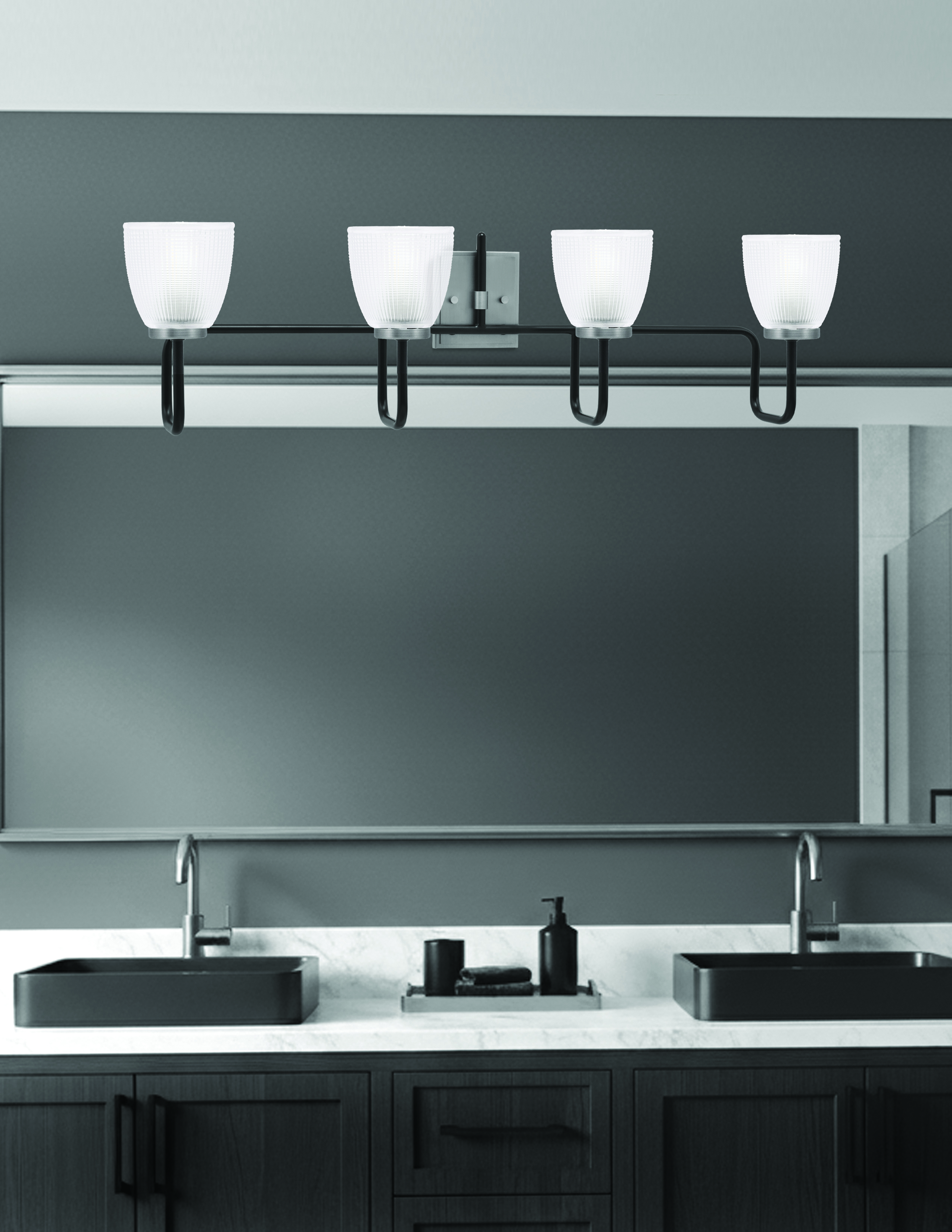 Elevate your bathroom with the Sandia 4-Light Bath Bar, a perfect blend of modern and industrial style. The striking Matte Black & Graphite Finish provides a bold, contemporary aesthetic, while the 5” Clear Ribbed Glass shades add texture and depth. The Sandia bath bar adds a refined and functional touch to your vanity area.