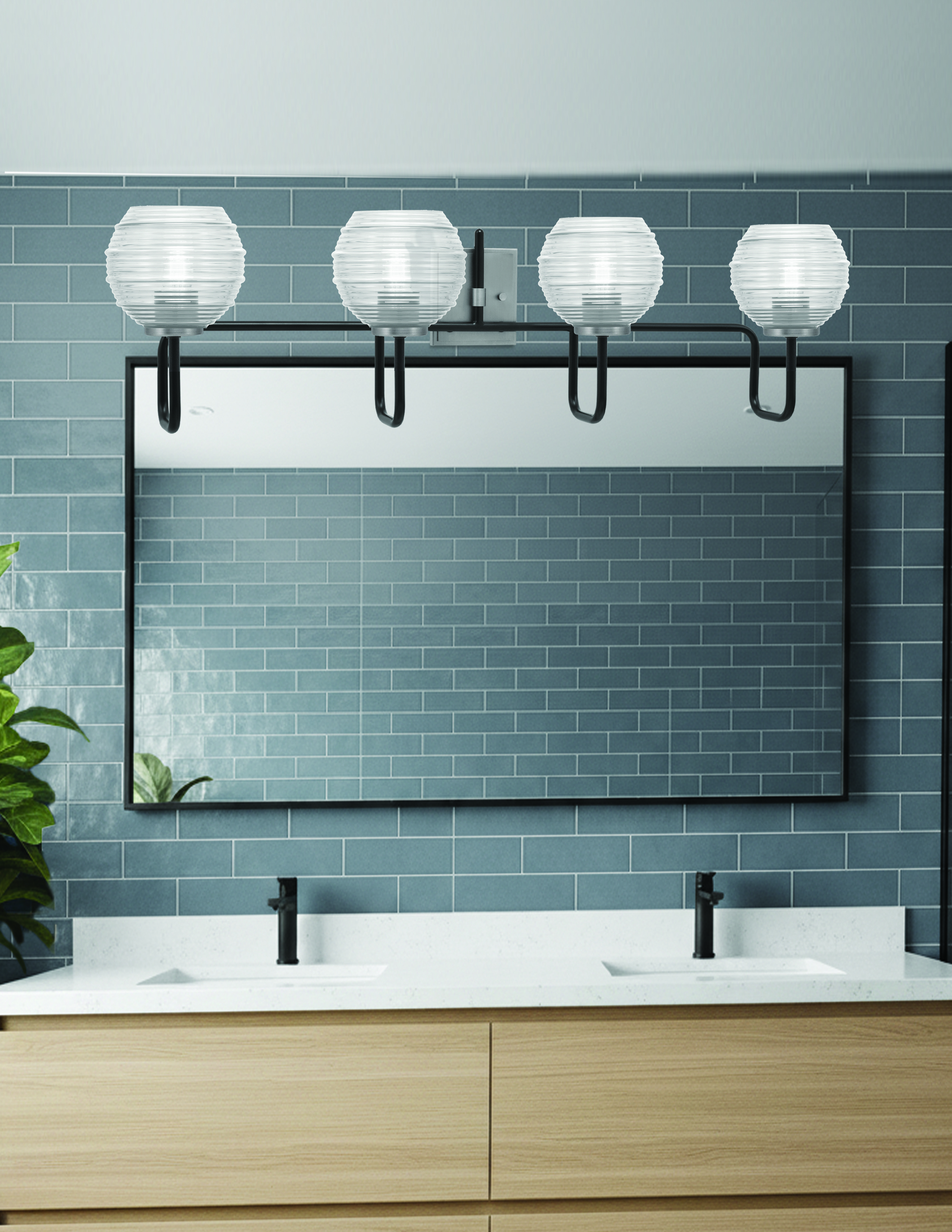 Bring sleek, contemporary elegance to your bathroom with the Sandia 4 Light Bath Bar. Featuring a bold Matte Black & Graphite finish, this fixture adds a touch of industrial sophistication. The contrasting dark finish enhances the illumination from the 6″ clear ribbed glass shades, creating a captivating lighting effect.