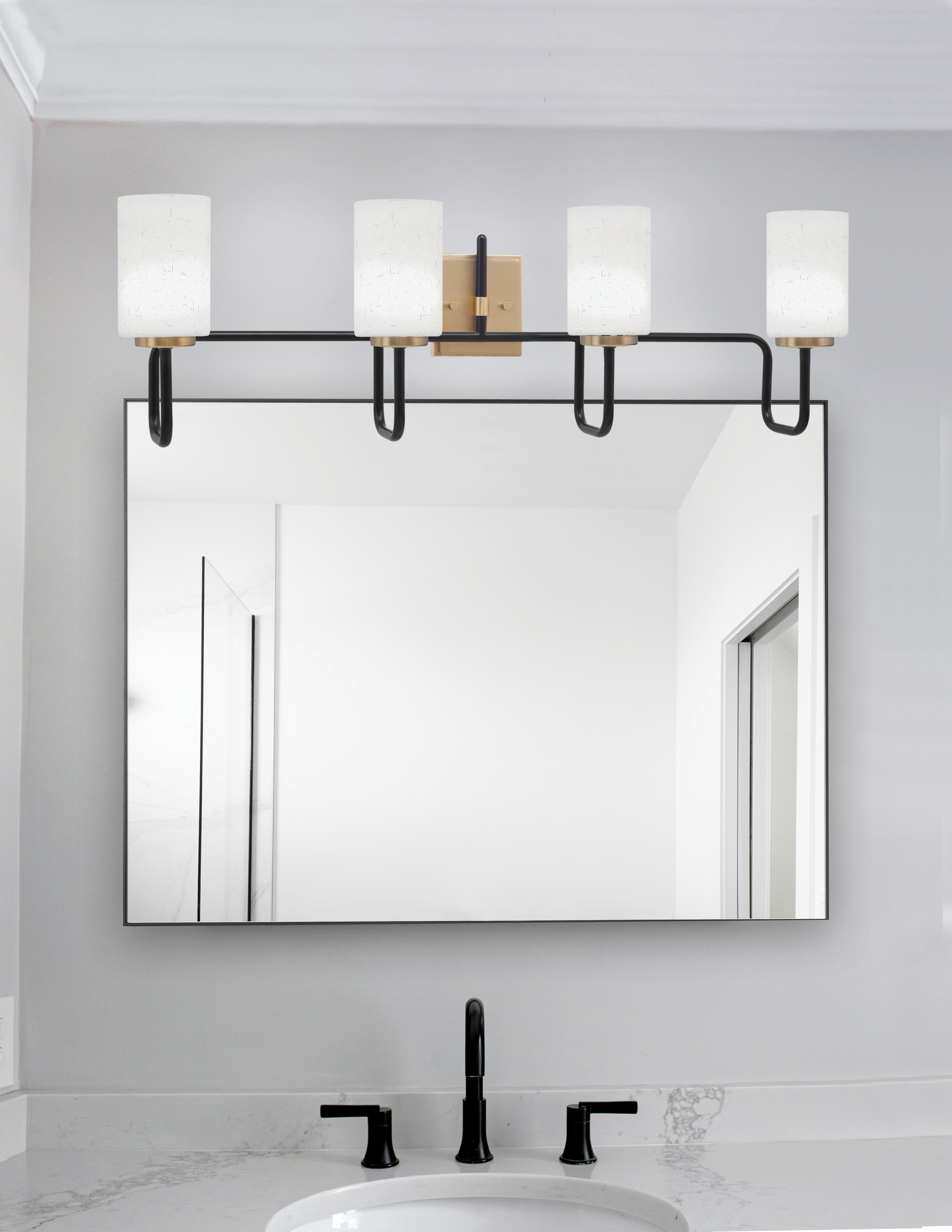 Bring elegance and modern flair to your bathroom with the Sandia 4 Light Bath Bar. The combination of Matte Black and New Age Brass finishes offers a bold, contemporary look that enhances any space. The 4″ White Muslin Glass shades provide soft, diffused light, creating a warm and inviting atmosphere in your bathroom.