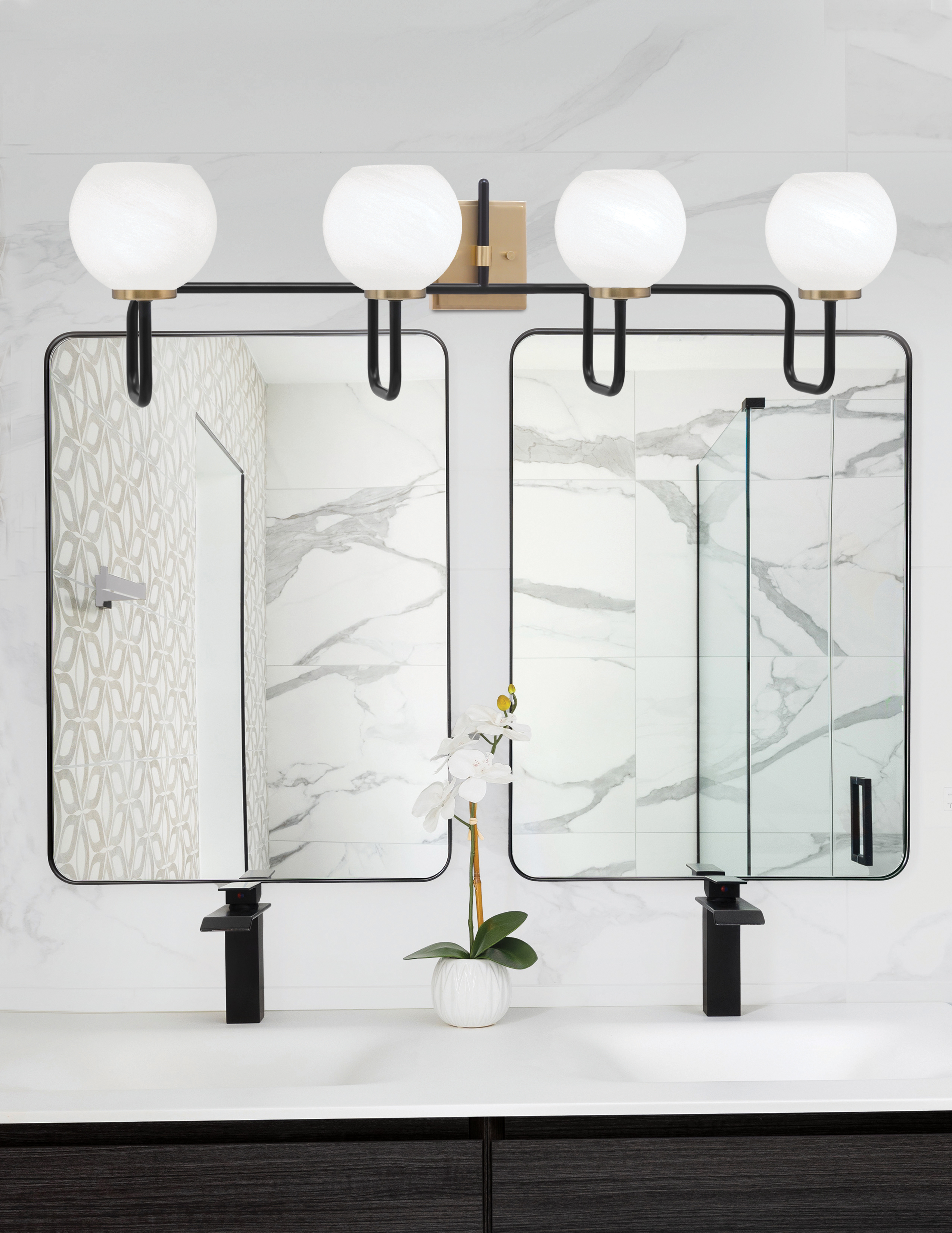 Elevate your bathroom with the refined design of the Sandia 4 Light Bath Bar. The striking combination of Matte Black and New Age Brass finishes creates a sophisticated look, perfect for modern spaces. The 5.75″ White Marble Glass shades add an elegant touch with their soft, marble-inspired pattern, offering a timeless and polished appearance.