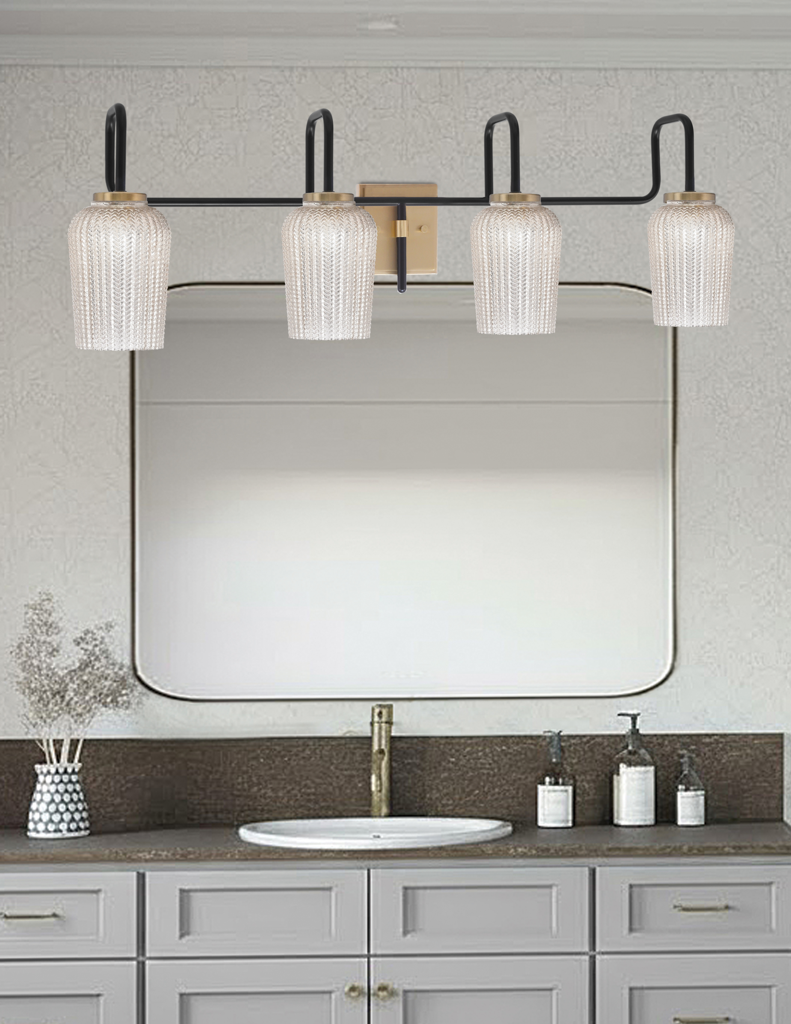 Combining sleek Matte Black with sophisticated New Age Brass, the Sandia 4 Light Bath Bar adds a contemporary touch to any bathroom. The 5″ Silver Textured Glass shades exude a refined shimmer, enhancing the lighting with a soft yet striking glow. Perfect for vanities or powder rooms, this fixture blends modern design with practical illumination.