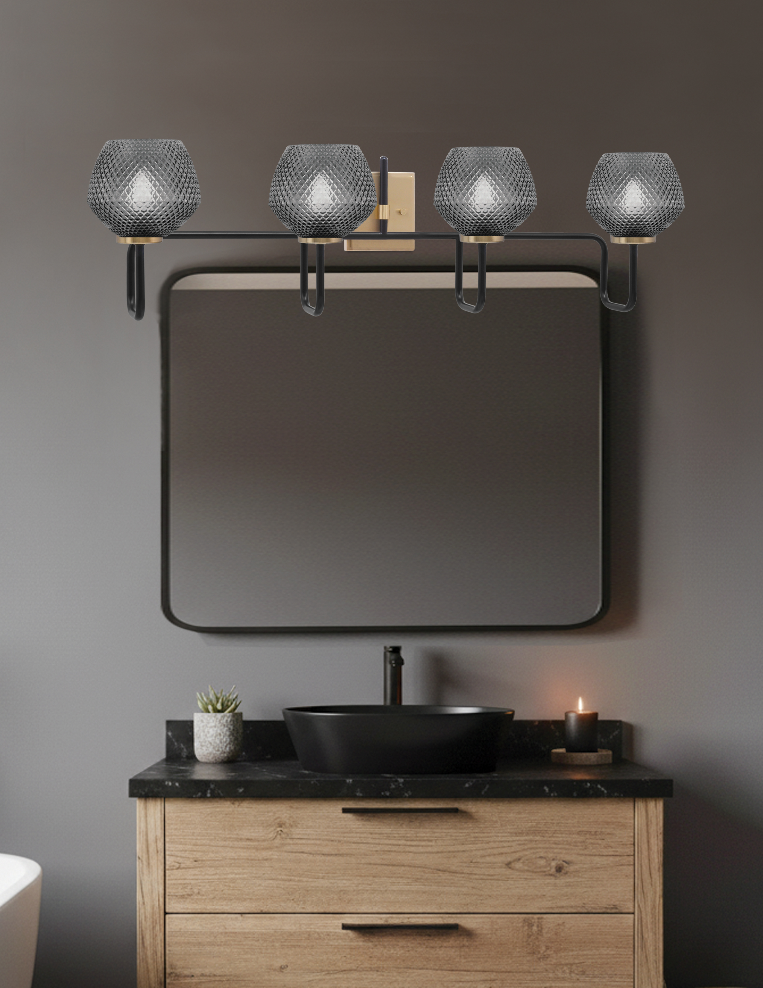 With its bold Matte Black and New Age Brass finishes, the Sandia 4 Light Bath Bar exudes a modern yet industrial charm. The 6″ Smoke Textured Glass shades offer a dramatic and sophisticated look, creating a warm and inviting glow that enhances the atmosphere. Perfect for vanities, powder rooms, or any bathroom in need of a stylish upgrade.