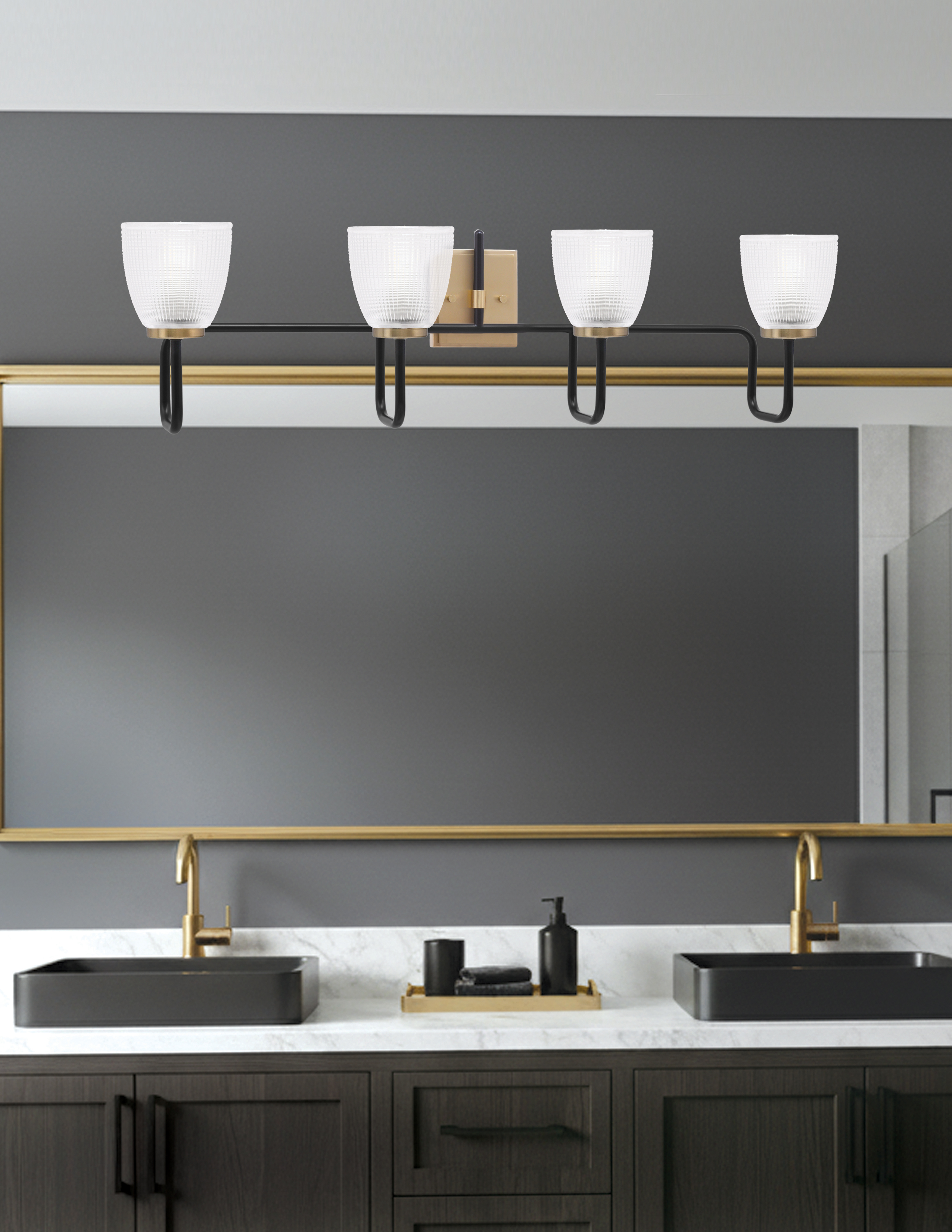 The Sandia 4 Light Bath Bar brings a chic, modern touch to your bathroom with its sleek design and functional elegance. The Matte Black and New Age Brass finishes create a striking contrast, while the 5″ Clear Ribbed Glass shades add texture and visual interest. Perfect for vanity lighting or as a statement piece in powder rooms.