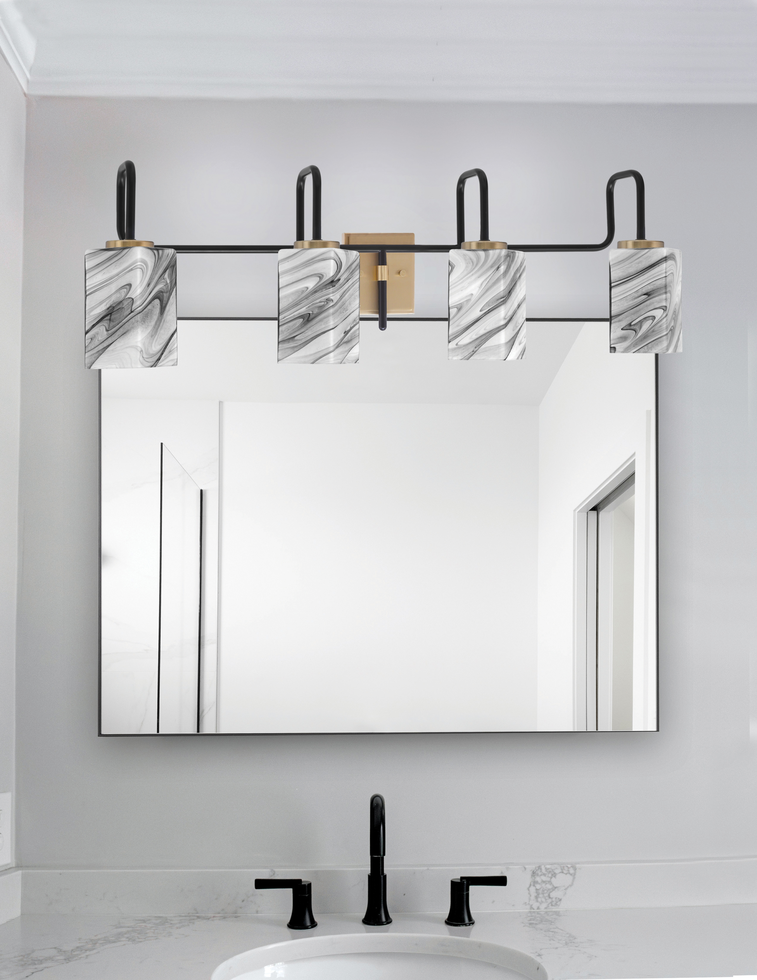 Elevate your bathroom”s décor with the sophisticated Sandia 4 Light Bath Bar. Featuring a modern combination of Matte Black and New Age Brass finishes, this bath bar makes a bold statement. The 3.5″ Square Onyx Swirl Glass shades bring an organic touch to the design, with unique swirls and a rich, dark onyx pattern that adds depth and character.