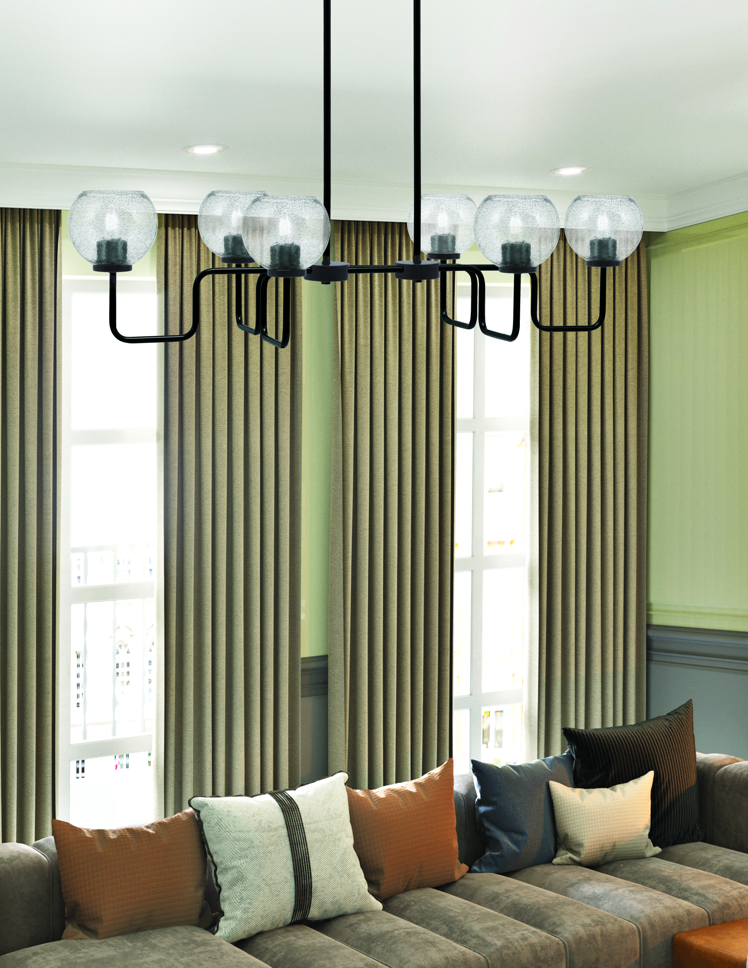 Create a captivating atmosphere with the Sandia 6 Light Island Light. The bold Matte Black finish enhances the distinctive look of the 5.75″ Smoke Bubble Glass shades, which exude a sophisticated smoky hue that adds depth and warmth to any room. The bubble glass texture creates unique lighting effects, while the matte black frame brings a sleek, modern touch.