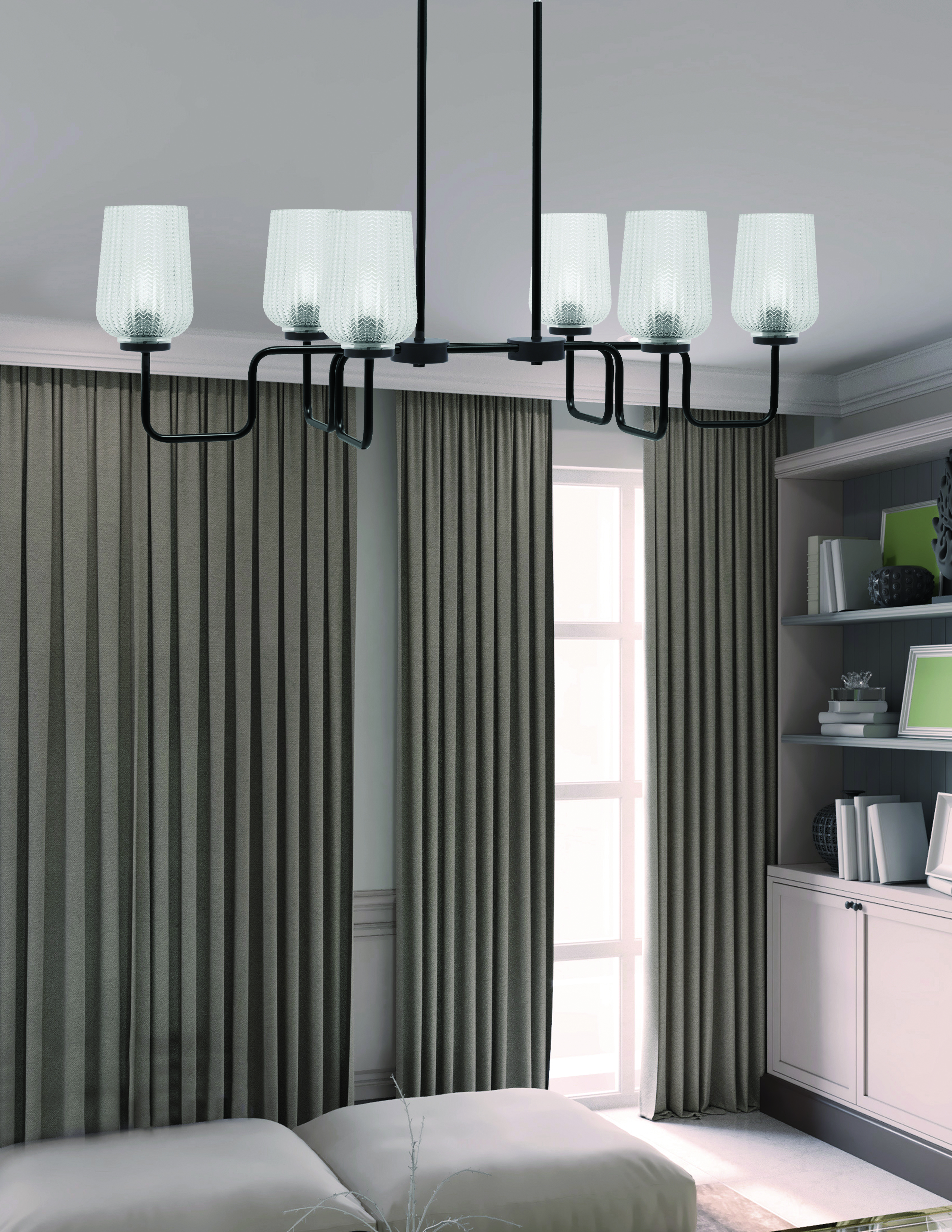 Illuminate your home with the Sandia 6 Light Island Light, featuring a modern Matte Black finish paired with stunning 5″ Clear Textured Glass shades. The textured glass adds visual intrigue and diffuses the light beautifully. The sleek matte black frame offers a sophisticated contrast to the clear glass, making this fixture the perfect addition to kitchen islands, dining areas, or any contemporary space.