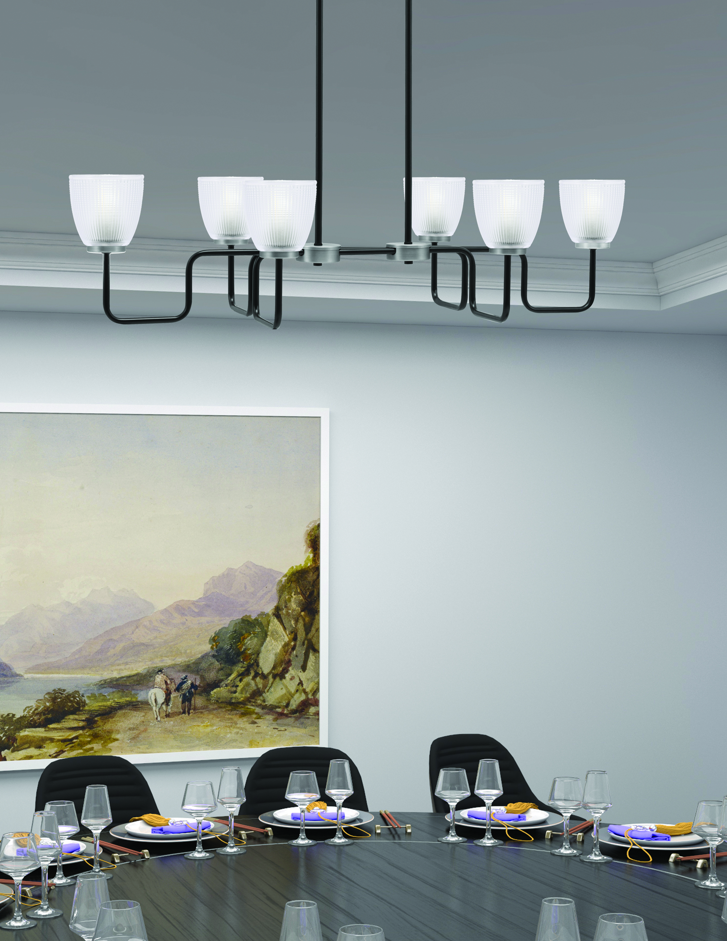 Add a touch of modern elegance to your kitchen or dining area with the Sandia 6 Light Island Light. Finished in a sophisticated Matte Black & Graphite, this light fixture offers an industrial yet refined look. The six 5-inch clear ribbed glass shades are the centerpiece of this fixture, offering both texture and light diffusion.