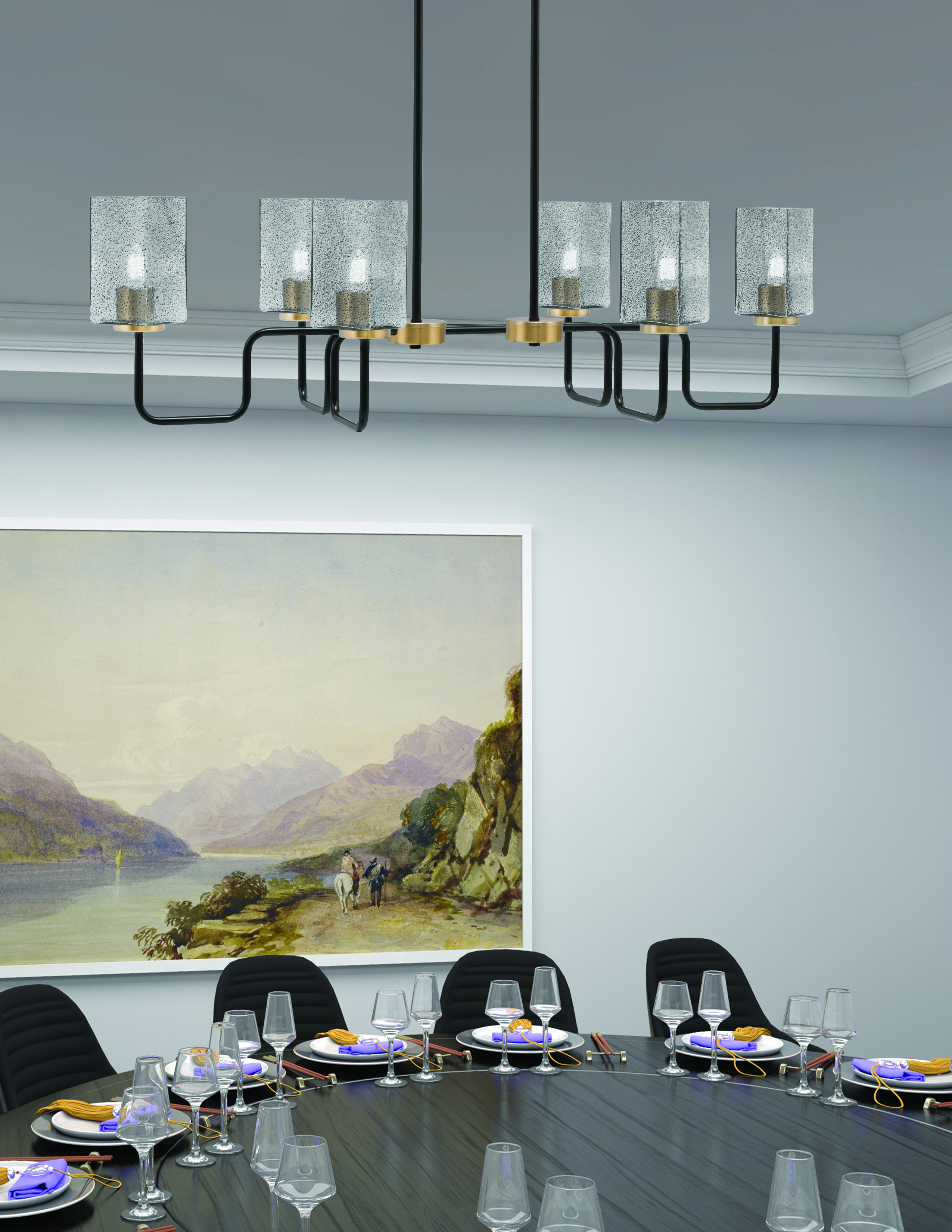 Elevate your space with the sleek, modern appeal of the Sandia 6 Light Island Light. Featuring a striking Matte Black & New Age Brass Finish and 3.5″ Square Smoke Bubble Glass shades, this fixture combines industrial charm with contemporary elegance. Ideal for kitchens, dining areas, or spacious islands.