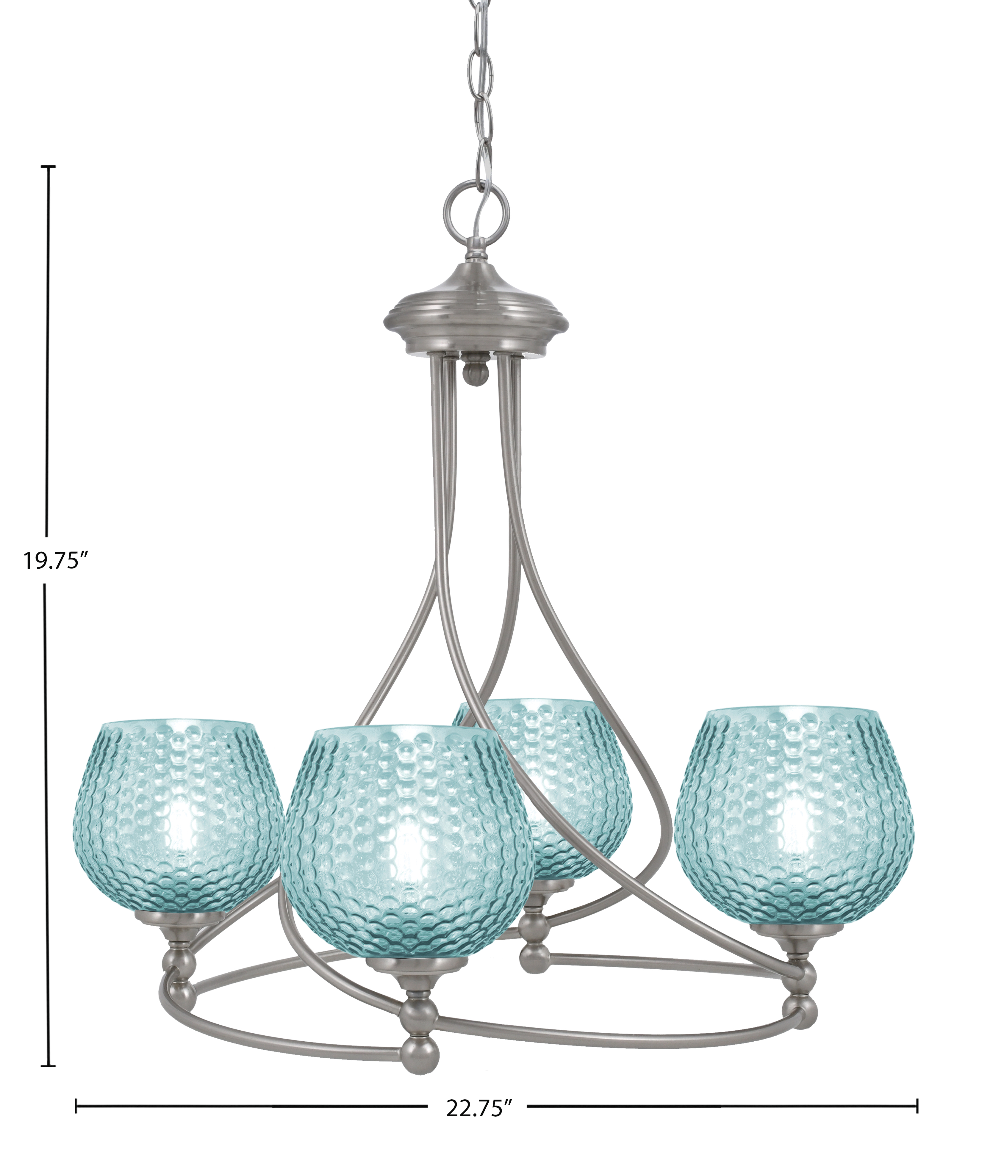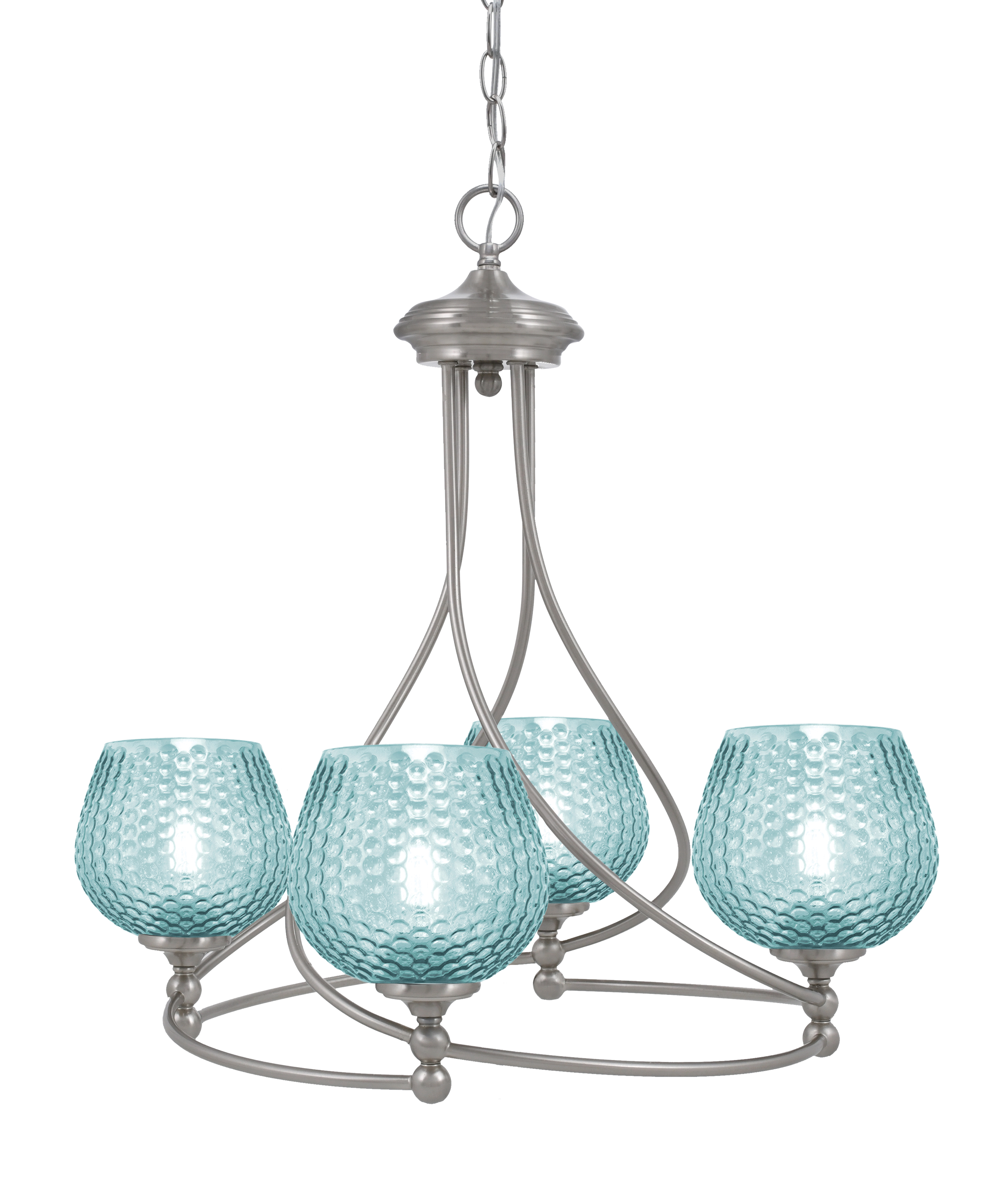 Infuse your space with color and contemporary style using the Capri 4 Light Uplight Chandelier, shown in a refined brushed nickel finish. This striking fixture features four 6-inch turquoise textured glass shades, bringing vibrant character and artistic flair to any room. Crafted for lasting durability and easy installation, the Capri 4 Light Uplight Chandelier is a perfect fusion of function and visual appeal.